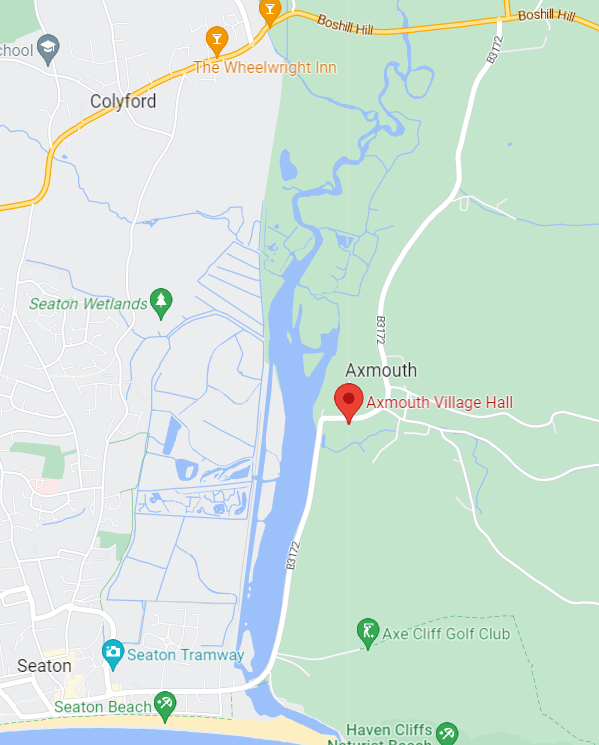 From the West on the A3052, continue past the turning to Seaton by the Tower Services petrol station and head down the hill through Colyford and in a mile turn right on the B3172 signposted for Axmouth and Seaton. Follow this road into Axmouth and the hall is on the left opposite the Harbour Inn.